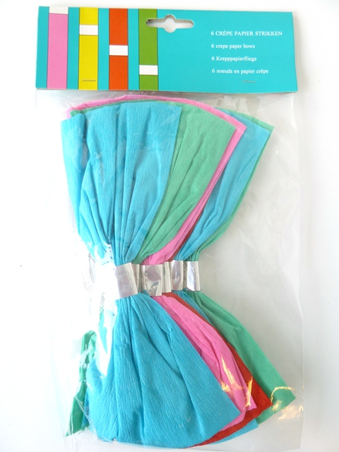 6 grote strikken van crepepapier. Kleuren: groen, blauw, roze en rood. Te bevestigen met een elastiekje.
