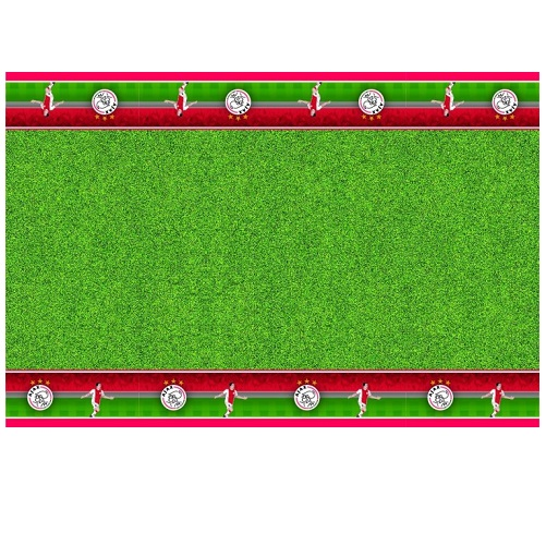 Platic tafelkleed van Ajax. De tafel lijkt net een groot grasveld met dit tafelkleed ajax. Met aan de zijkant het Ajax logo en een afbeelding van een voetballer. Passend bij de rest van de Ajax partijtje decoratie.