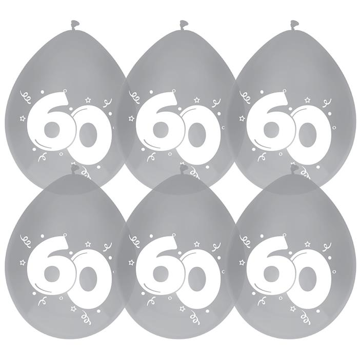 Mooie grote ballons van ongeveer 30cm groot met de tekst 60 jaar. Deze gekleurde 60 jaar ballonnen zijn hangend bedrukt en kunnen het beste met lucht opgeblazen worden. Met helium staat de tekst op zijn kop. 6 stuks in een zakje en allemaal in licht zilver met witte cijfers.