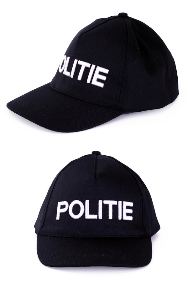 Zwarte verstelbare baseballpet met in het Nederlands politie. De politiepet is verstelbaar dus past altijd.