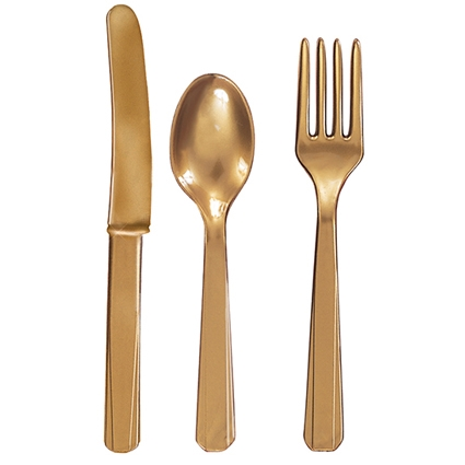Een pakje met 18 delig plastic goud bestek. Het gouden bestek bestaat uit 6 messen, 6 vorken en 6 lepels.