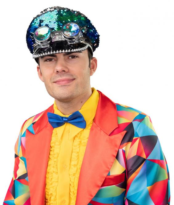 Toffe gekleurde festival hoed of pet die bekend is geworden door het burning man festival in Nevada maar ondertussen voor elk festival of carnavals feest te gek is om te dragen. De hoed is one size, ongeveer hoofdmaat 59 en bestikt met reversible blauw, groene en zilveren pailletten. De zijkant is beplakt met zilveren studs en de klep met spikes. Voorop de pet zit een zilveren steampunk bril met holografische glazen.