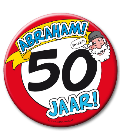 Extra grote button met de tekst Abraham 50 jaar! Leuk om de jarige op zijn speciale dag mee te laten rondlopen. De button is 10cm doorsnee.