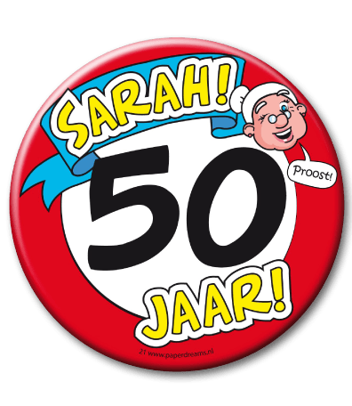 Leuk cadeau voor de 50 jarige. Een grote XXL button met een Sarah 50 jaar afbeelding. De badge is 10cm doorsnee.