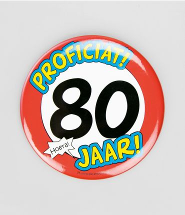 Extra grote button met de tekst proficiat 80 jaar! Leuk om de jarige op zijn speciale dag mee te laten rondlopen. De button is 10cm doorsnee.