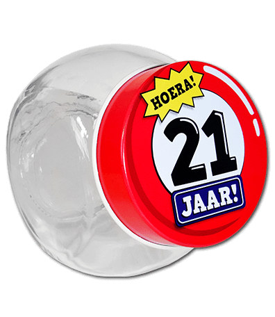 Glazen snoeppotje om zelf te vullen! Een vrolijk cadeau voor een 21 jarige! Met het kleurrijke design en een mooi formaat (circa 7,5 cm x 8 cm) hebben de Candy Jars een feestelijke uitstraling.
