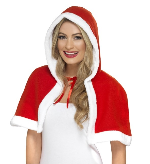 Leuke korte kerstcape met capuchon voor over een kerstjurkje. Om te binden door middel van een lintje.