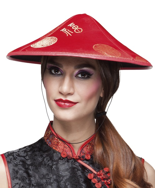 Prachtige Chinese hoed gemaakt van rode satijnen stof met Chinese print. Op de foto staat een vrouw maar deze hoed is ook prima gechikt voor mannen.