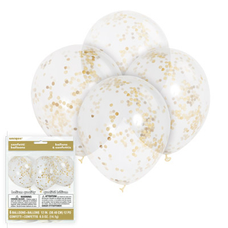 Zakje met 6 transparante ballonnen inclusief gouden confetti. Doe de confetti in de ballon en blaas ze op met lucht of helium.
