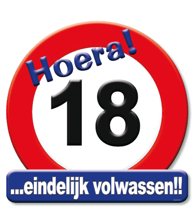 Groot kartonnen bord in de vorm van een verkeersbord met een grote 18 afbeelding erop. Dit huldeschild is 50cm x 50cm groot en gewoon op te hangen met een plakbandje of punaise.