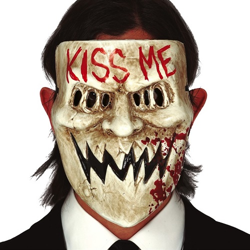Hard plastic Purge masker met de tekst Kiss me. Het masker bedekt alleen de voorkant van je gezicht en is op te zetten door middel van stevig elastiek.
