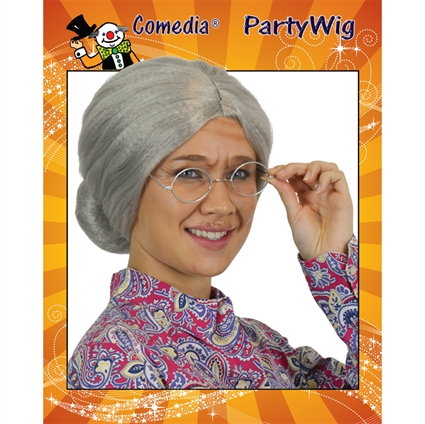 Zo ziet niet elke oma eruit, maar…..het geeft zo’n mooi nostagisch plaatje. Leuke grijze pruik met een knotje op de achterkant. One size, maar met elastiek dus past op elk hoofd.