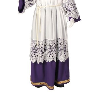 Vele Sinten vinden het niet prettig dat hun smetteloze albe (onderjurk) zo vlak over de grond sleept met lopen i.v.m. vies worden. Ook trapt per ongeluk de Sint natuurlijk wel eens op zijn onderjurk en wanneer het kant wat fragiel is kan het makkelijk beschadigen. Daarom deze onderrok. De witte albe kan dan iets hoger opgebonden worden met het koord en daaronder uit komt dan deze prachtige onderrok. Niet alleen zeer praktisch dus, maar ook erg fraai. De onderrok wordt met verstelbare banden van hetzelfde materiaal op maat gezet. Ook een uitvinding voor lange Sinten wiens onderjurk wat aan de krappe kant is. Samen met de onderrok vormt het een passend geheel.