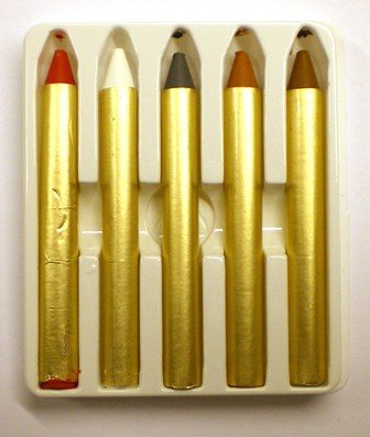 Ideaal eenvoudig oudmaaksetje voor sint en piet en alle andere basis beschaduwingen. In dit setje zitten 5 vette kleine schminkstifjes in de kleuren: wit, rood, grijs, bruin en lichtbruin. Ideaal om na de basiskleur van Sint of of andere oude gezichten, het gezicht iets natuurlijker en ouder te maken. Wit om op te lichten, rood in de ooghoeken, bruin langs de schaduwen, grijs een beetje voor de wallen en het rood is natuurlijk ook voor piet’s lippen en het ene licht bruine stiftje is prima om te gebruiken, voor de kleine nuances. Zie voor een uitgebreide collectie schmink onze afdeling grimeerartikelen.