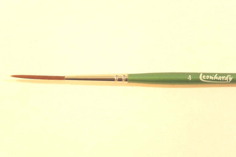 Dit is een zeer bijzondere penseel. Dit penseel wordt een sleper genoemd en is extra lang. Zo’n penseel is bedoeld om dunne lijnen in een strakke bocht of lijn te trekken. Met dit 20mm lange kunsthaar van dit penseel is het strakste bochtenwerk werk ooit te maken! Het penseeltje heeft een werkbreedte van 4 mm. Het vatting is van roestvrijstaal en de steel is van gelakt kunststof in het groen. Het merk is Leonhardy en staat dus voor kwaliteit. Een juweel van een penseel om “erbij ” te hebben.