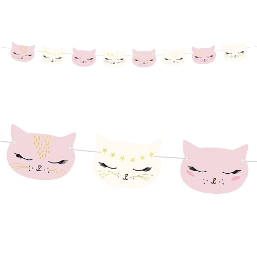 Poezelig poezen slingertje met schattige kleine kartonnen poezen kopjes. De slinger is 1.4m lang en past bij de rest van de poezen partijtje versiering.