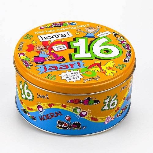 Snoepblik of koektrommel met een grappige 16 jaar print. Leuk om zelf iets in te stoppen en cadeau te doen. Het blik is 14cm doorsnee.