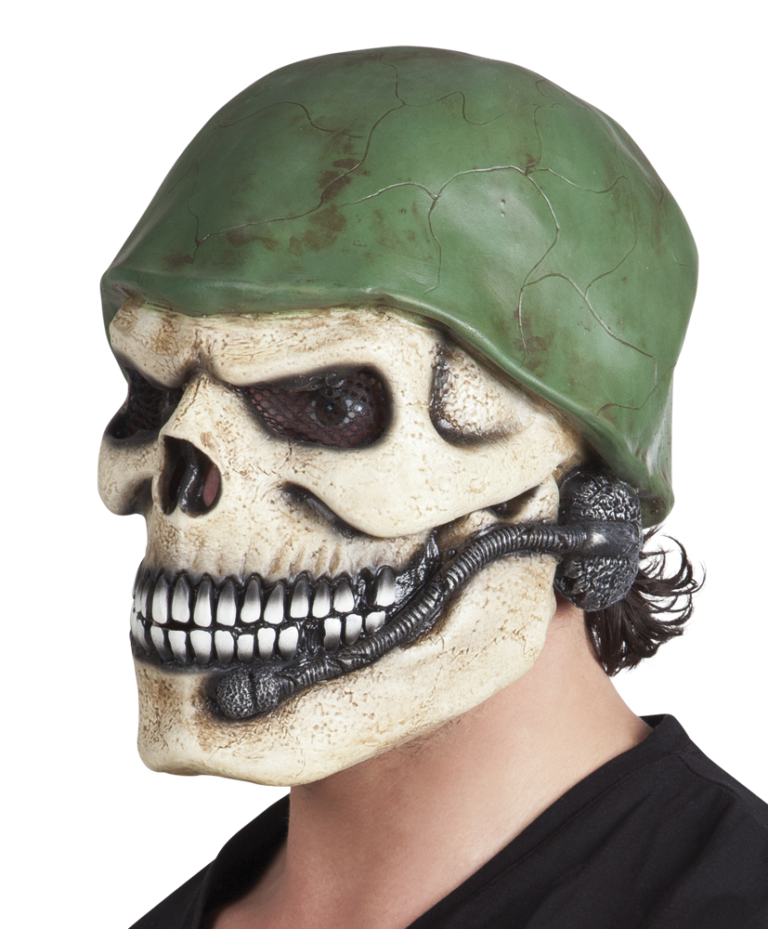 Latex masker van de schedel van een overleden soldaat. Gemaakt van mooie soepele kwaliteit latex. Aan de achterkant sluit het masker niet helemaal aan tot onderaan je hoofd waardoor er een stukje hoofd en nek vrij is.