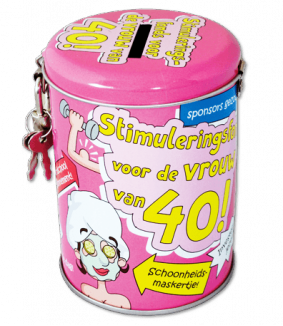 Spaar pot voor de jarige job die 40 jaar gaat worden! Van blik en afsluitbaar met een sleuteltje. Deze spaarpot is speciaal voor de 40 jarige vrouw.