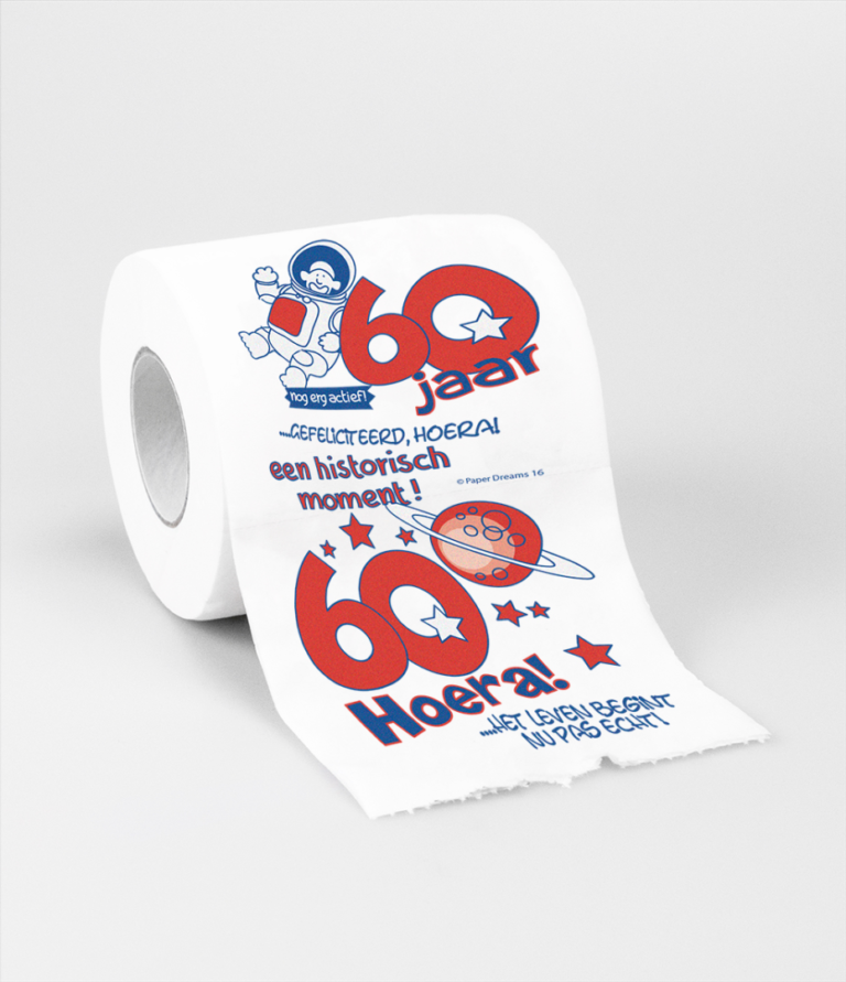 Grappige rol toilet papier voor de 60 jarige. Geschikt voor zowel mannen als vrouwen. Met allemaal grappige afbeeldingen en teksten.