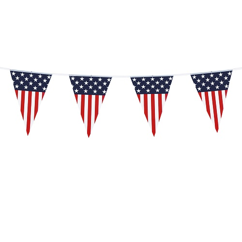 Plastic vlaglijn in de kleuren van de vlag van de Verenigde staten van Amerika, oftwel de USA. Deze Amerikaanse slinger is vanwege het materiaal ook goed buiten te gebruiken.
