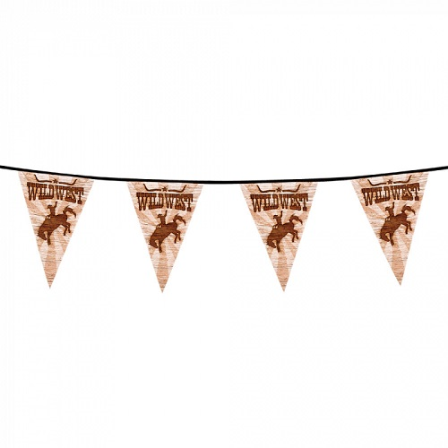 Plastic slinger van 6 meter lang met cowboy opdruk. De vlaglijn is enkelzijdig bedrukt en kan vanwege het materiaal ook heel goed buiten opgehangen worden.