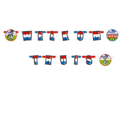 Rood-wit-blauwe letter slinger met de tekst ‘welkom thuis’. Tussen de letters zitten plaatjes van typische Hollandse dingen zoals een koe, tulpen en een molen. Op de foto is de slinger onder elkaar gezet maar hij loopt in werkelijkheid in één keer door.